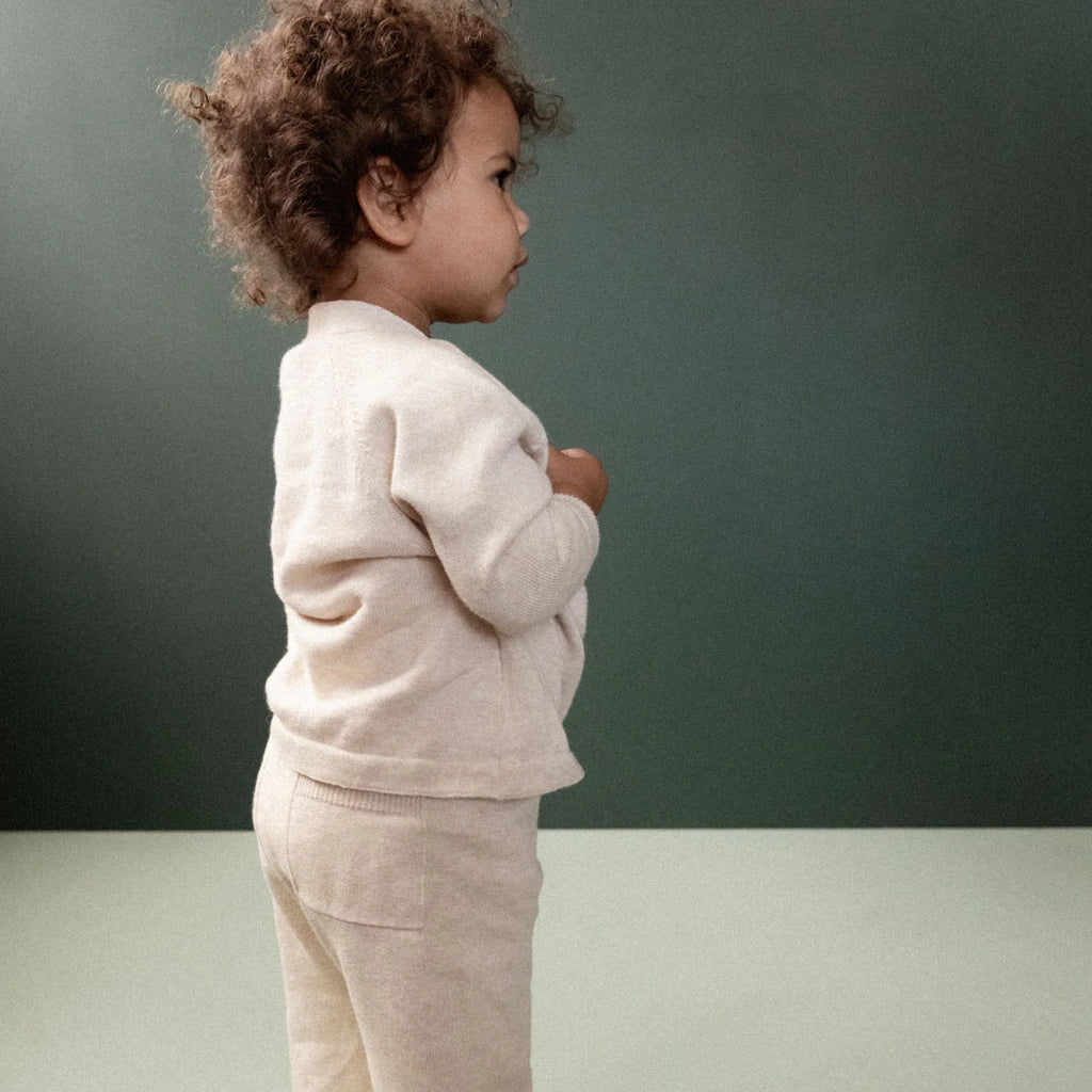The Cecil Pant is made from soft organic cotton knit with a wide leg fit for easy movement and all-day wear. Featuring a gentle elastic waistband with a functional drawcord and a sweet pocket detail at the back. Pair with the Cecil Cardigan for a cosy outfit.