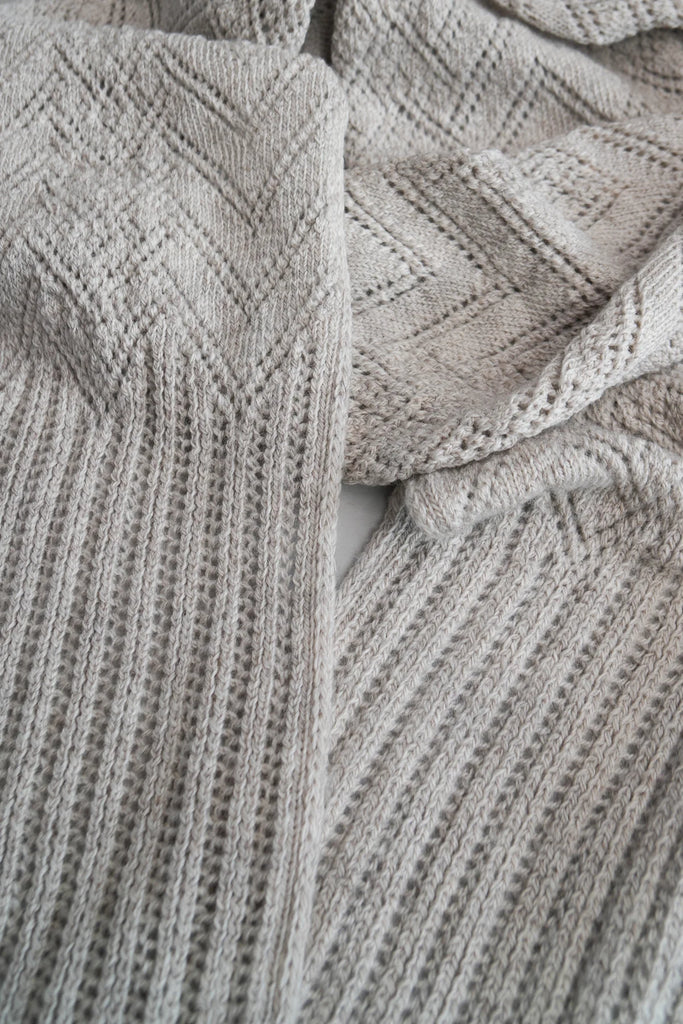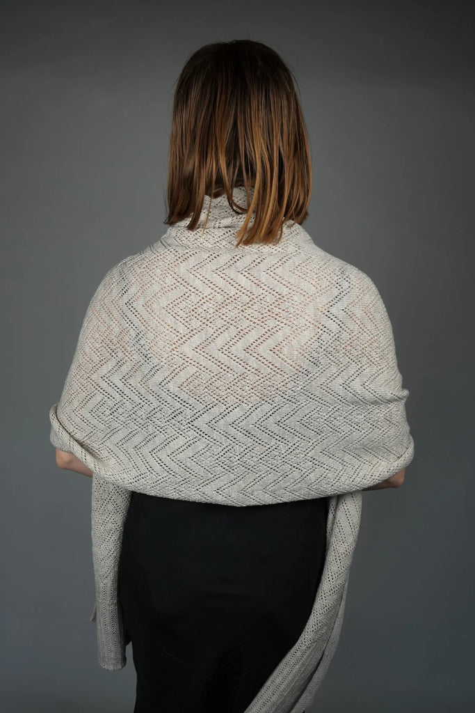 The lace stitch pattern of this wrap takes its inspiration from river rapids, with water changing from smooth and swift to rough and chaotic. Made from Otago Polwarth wool and a uniquely New Zealand wild breed of ancient Merino wool called Arapawa. It has been processed without superwash treatments to preserve the character of these unique fibres.