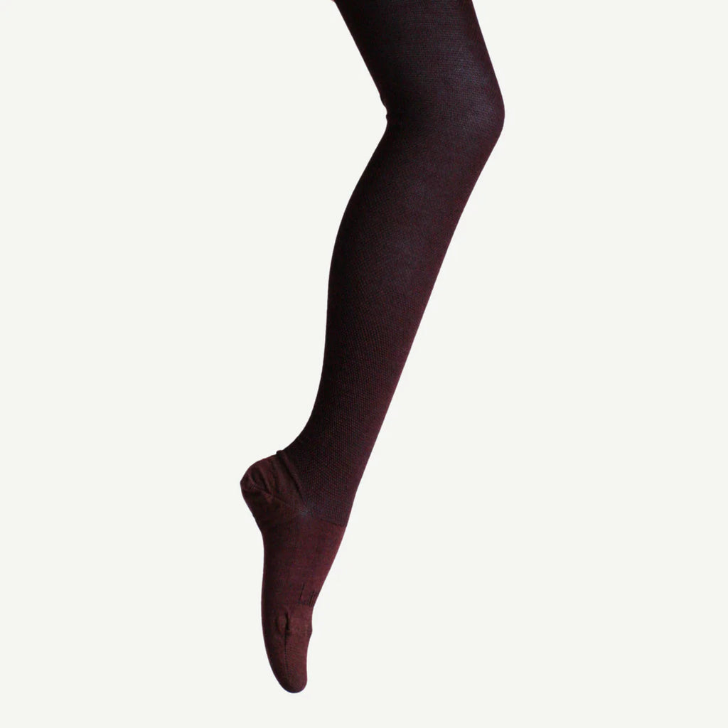 The textured weave style has a more generous fit that our flat knit and cable tights.
