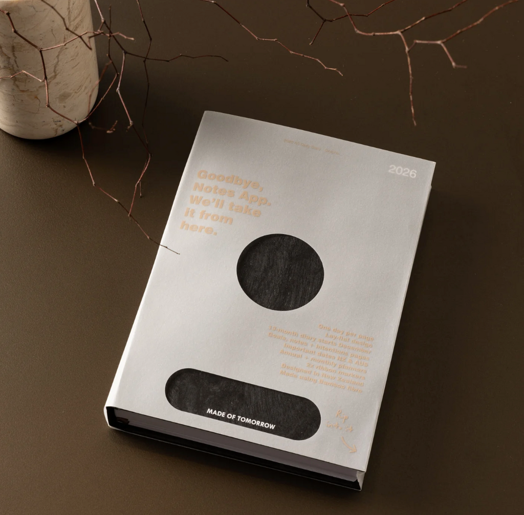 2026 A5 Daily Diary – Where Sustainability Meets Functionality. Crafted from bamboo fibre and thoughtfully designed in New Zealand to keep you organised and inspired all year long. Arriving in all new custom packaging — complete with a rip tab for that oh-so-satisfying unboxing moment.