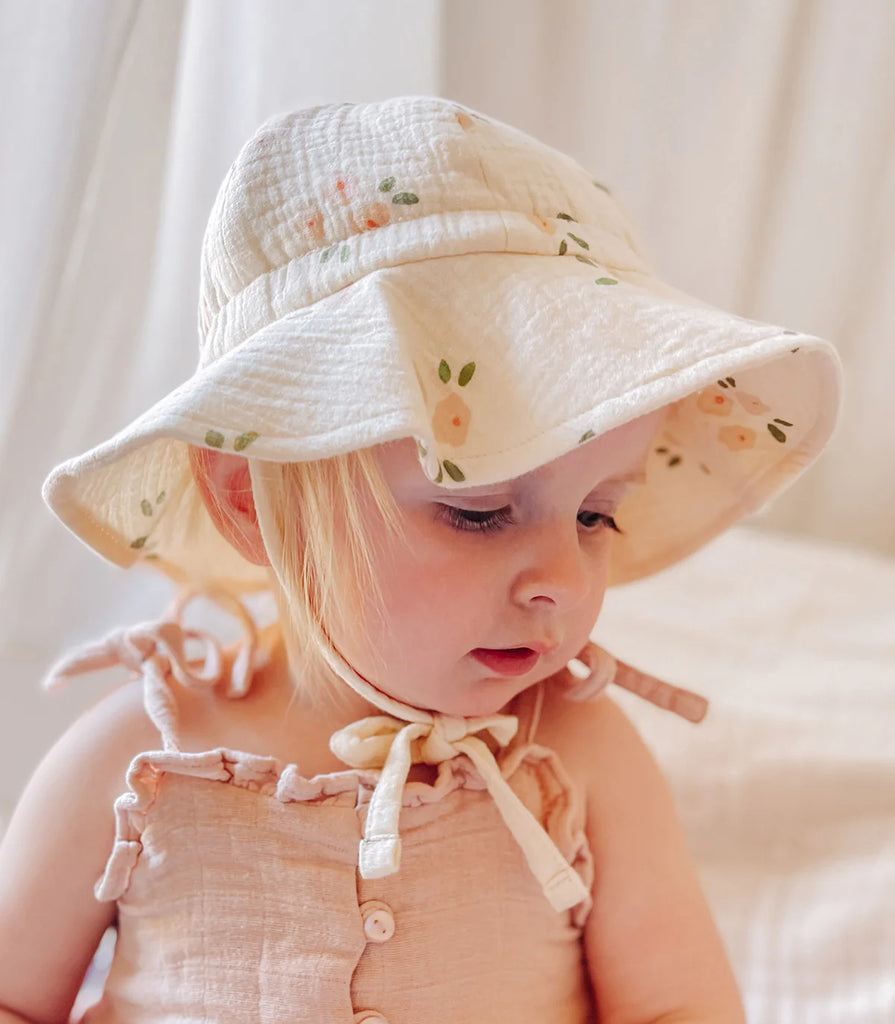This adorable hat is made from 4 layers of GOTS certified organic cotton muslin. It's soft, lightweight and comfortable for little ones to wear.